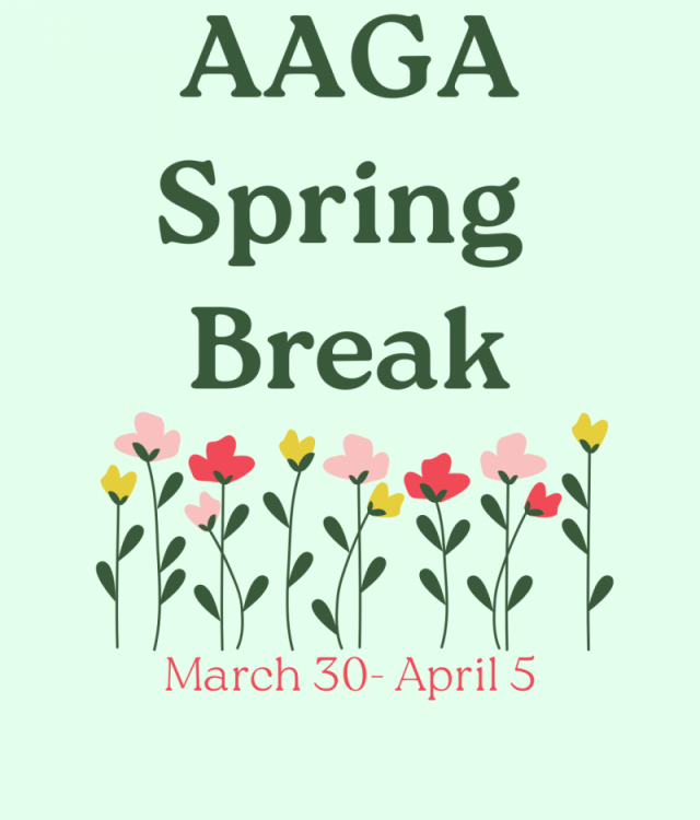 AAGA will be closed for Spring Break March 30-April 5, 2026 Athletes attending the Regional Championships will have practice, days TBD.